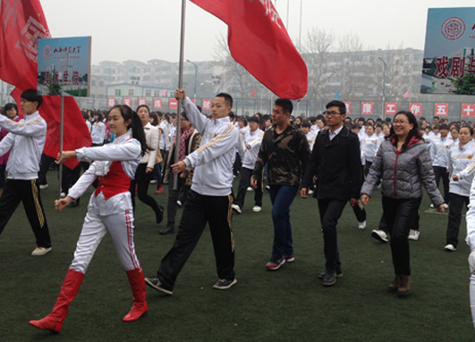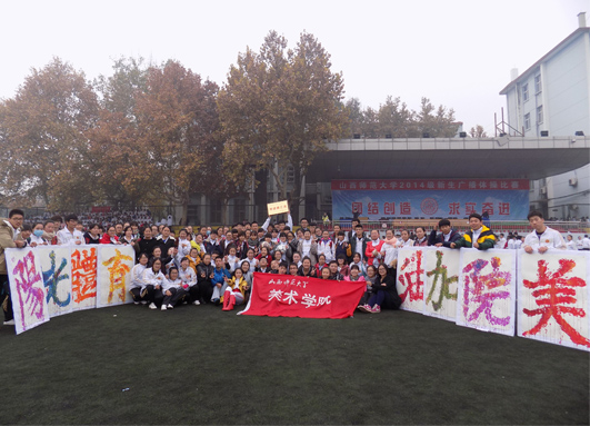 方队出场顺序为甲组第五,带队老师为院团委书记刘昂、大一辅导员贾娟老师。在第九套广播体操的音乐声中,同学们着装统一、动作整齐划一,精神抖擞,宛如初升的太阳,朝气蓬勃。除此之外,在方队的两次立着八个彩色大字:“阳光体育、美院加油”,包括表演结束前的“美”字造型,都格外吸引全场师生注目。据了解,这个彩色八字都是由大一参赛的这111名学生,用自己的双手,沾满美丽的色彩拼印而成,他们说,“我们支持和热爱体育运动,每天跑跑步,做做操,上课学习也觉得精神饱满。”