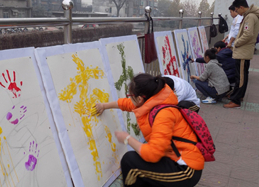 学生双手涂满颜料印制“阳光体育 美院加油”八个彩色大