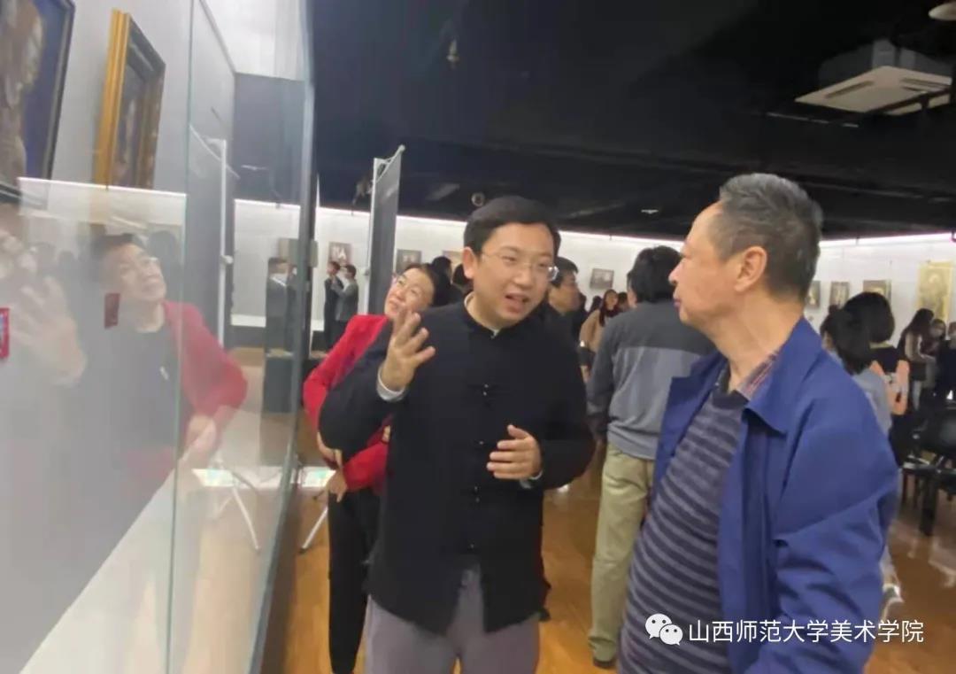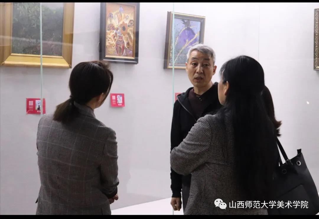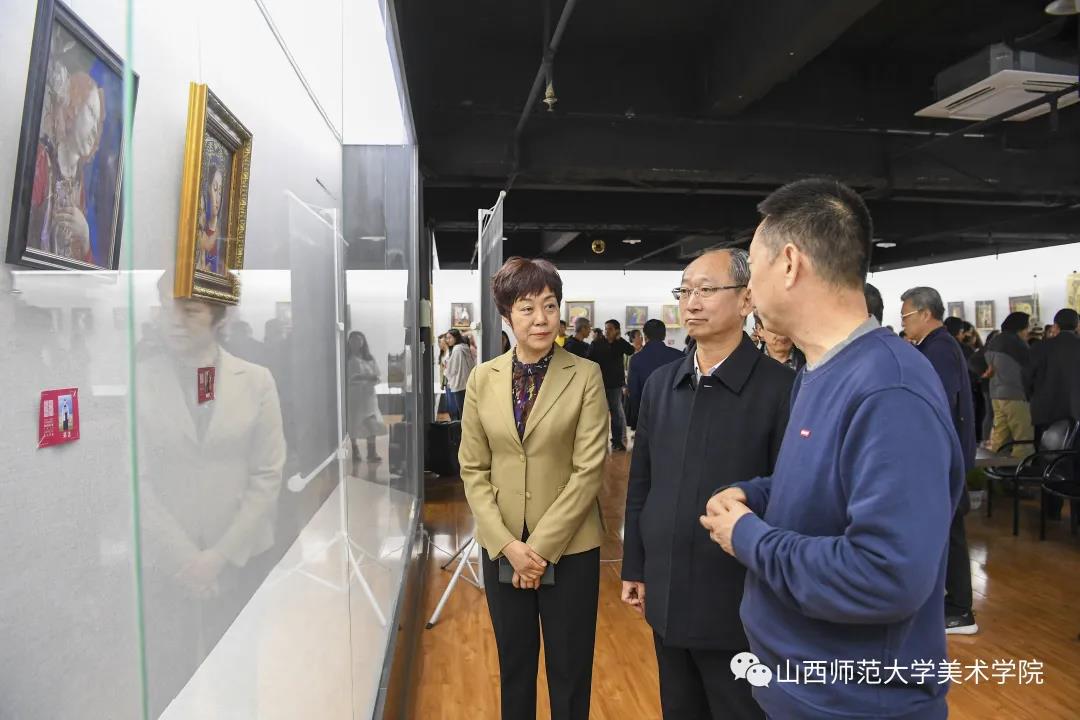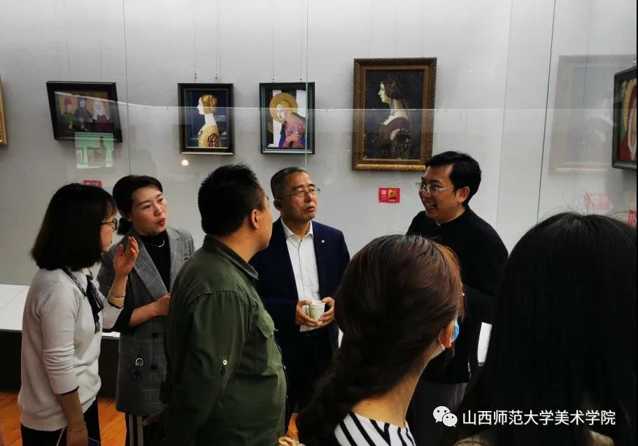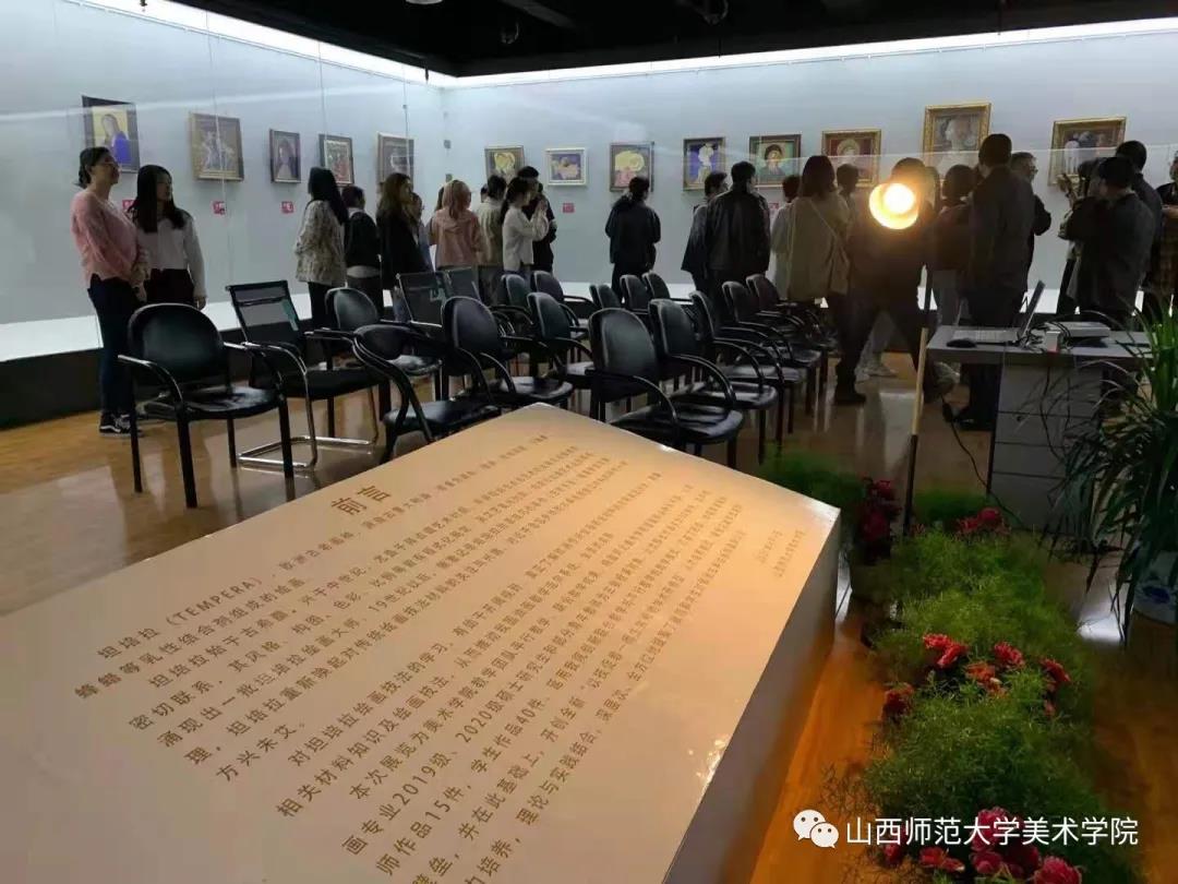 作品展览现场,众多校院领导、老师同学以及艺术爱好者络绎不绝前来参观,各位参观者俯身向前,仔细品读、体会坦培拉绘画的细腻与优雅。